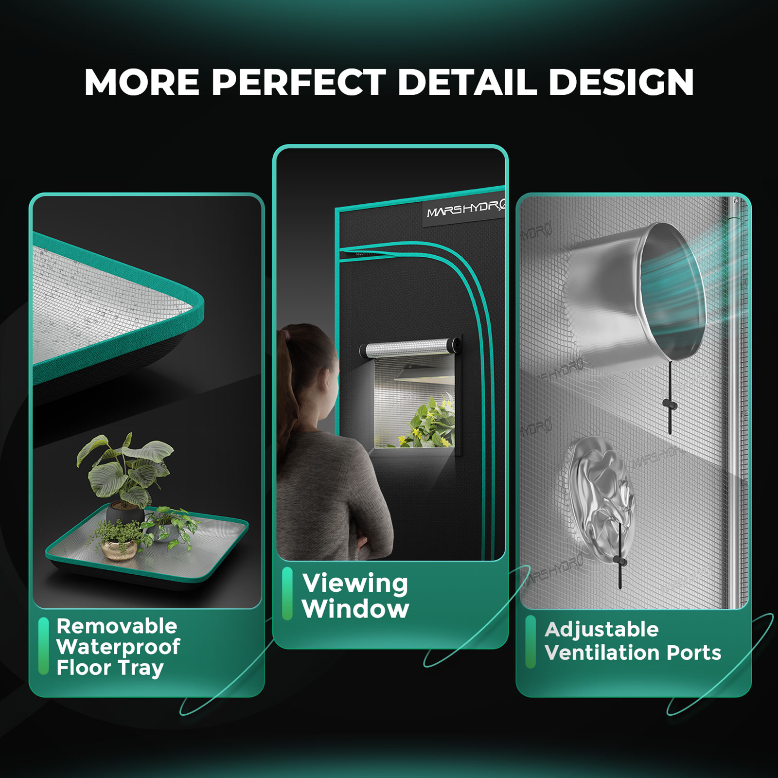Fabricada con tejido Oxford 1680D resistente a desgarros , la carpa de cultivo Mars Hydro de 100 x 100 x 180 cm ofrece una durabilidad superior y un sellado hermético a la luz. Una solapa protectora para la cremallera, de diseño especial, evita las filtraciones de luz en esta zona, garantizando la seguridad del ciclo de luz. El revestimiento reflectante de Mylar de alta calidad integra la carpa al sistema de iluminación, mejorando el aprovechamiento de la luz hasta en un 10-15% para obtener mayores rendimientos y resultados de cultivo interior consistentes.